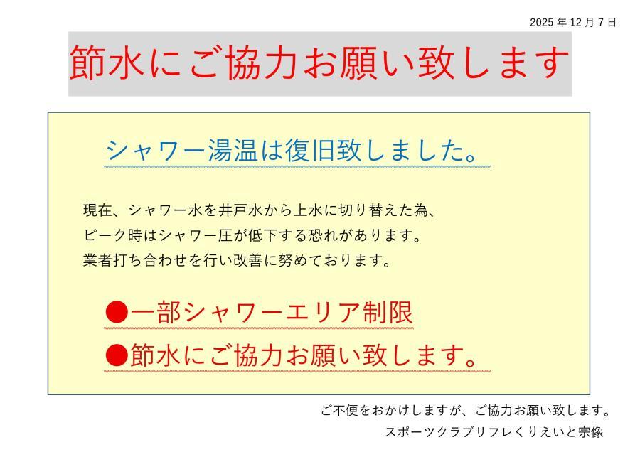 シャワー湯温復旧と一部シャワーエリア制限のお願い